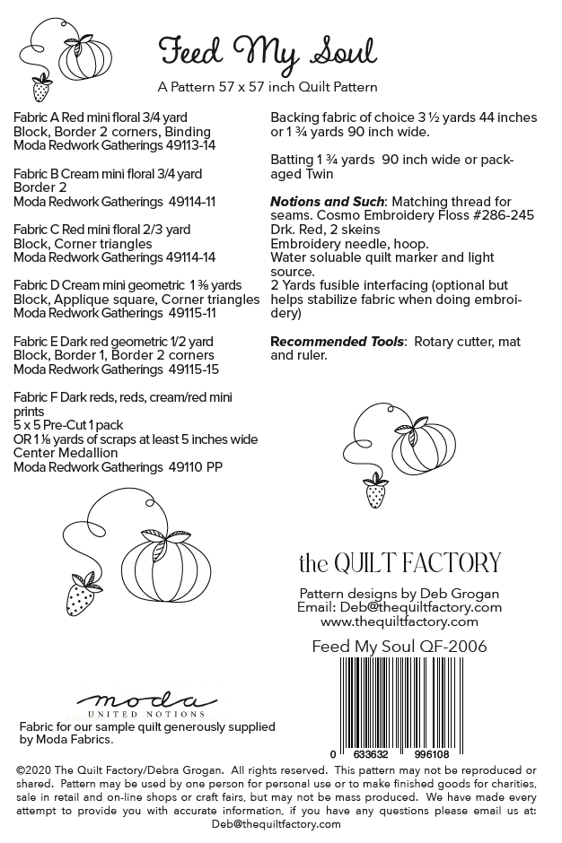 ©2020 The Quilt Factory/Debra Grogan. All rights reserved. The pattern contained in this kit may not be reproduced or shared. Pattern may be used by one person for personal use or to make finished goods for charities, sale in retail and on-line shops or craft fairs, but may not be mass produced. We have made every attempt to provide you with accurate information and fabric cuts, if you have any questions please email us at: Deb@thequiltfactory.com