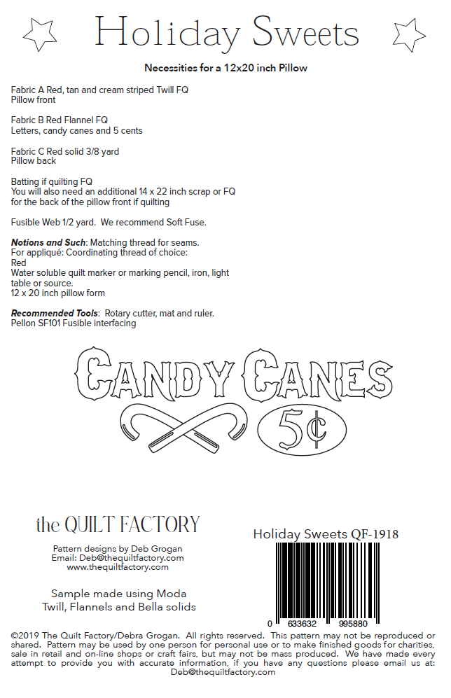 ©2019 The Quilt Factory/Debra Grogan. All rights reserved. The pattern contained in this kit may not be reproduced or shared. Pattern may be used by one person for personal use or to make finished goods for charities, sale in retail and on-line shops or craft fairs, but may not be mass produced. We have made every attempt to provide you with accurate information and fabric cuts, if you have any questions please email us at: Deb@thequiltfactory.com