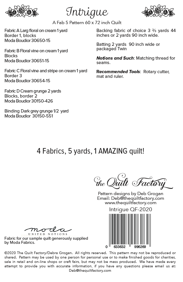 ©2021 The Quilt Factory/Debra Grogan. All rights reserved. This pattern may not be reproduced or shared. Pattern may be used by one person for personal use or to make finished goods for charities, sale in retail and on-line shops or craft fairs, but may not be mass produced. We have made every attempt to provide you with accurate information, if you have any questions please email us at: Deb@thequiltfactory.com