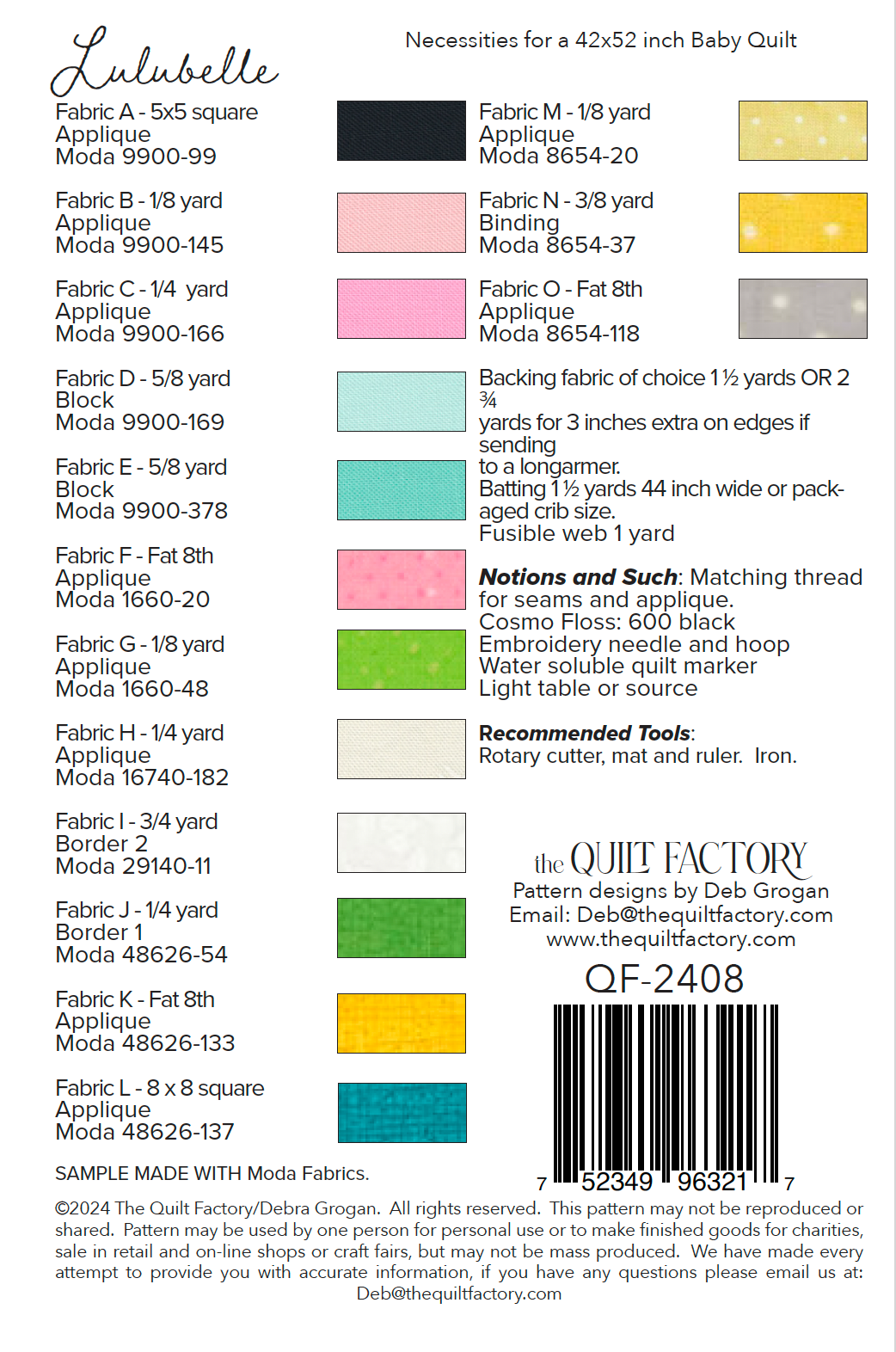 ©2024 The Quilt Factory/Debra Grogan. All rights reserved. The pattern may not be reproduced or shared. Pattern may be used by one person for personal use or to make finished goods for charities, sale in retail and on-line shops or craft fairs, but may not be mass produced. We have made every attempt to provide you with accurate information, if you have any questions please email us at: Deb@thequiltfactory.com