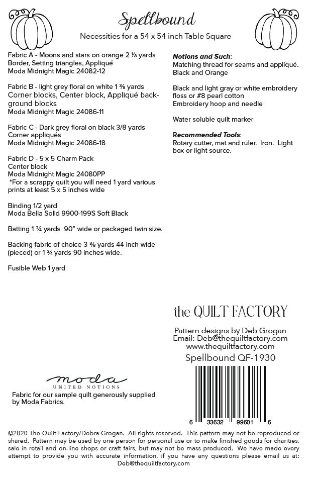 ©2019 The Quilt Factory/Debra Grogan. All rights reserved. This pattern may not be reproduced or shared. Pattern may be used by one person for personal use or to make finished goods for charities, sale in retail and on-line shops or craft fairs, but may not be mass produced. We have made every attempt to provide you with accurate information, if you have any questions please email us at: Deb@thequiltfactory.com