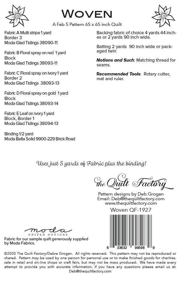 ©2020 The Quilt Factory/Debra Grogan. All rights reserved. This pattern may not be reproduced or shared. Pattern may be used by one person for personal use or to make finished goods for charities, sale in retail and on-line shops or craft fairs, but may not be mass produced. We have made every attempt to provide you with accurate information, if you have any questions please email us at: Deb@thequiltfactory.com