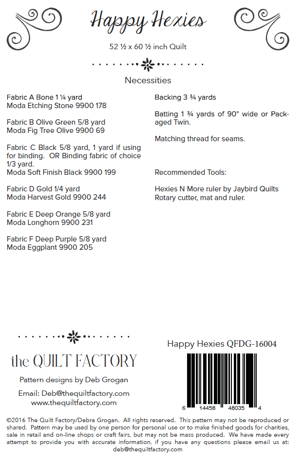 ©2015 The Quilt Factory/Debra Grogan. All rights reserved. This pattern may not be reproduced or shared. Pattern may be used by one person for personal use or to make finished goods for charities, sale in retail and on-line shops or craft fairs, but may not be mass produced. We have made every attempt to provide you with accurate information, if you have any questions please email us at: Deb@thequiltfactory.com