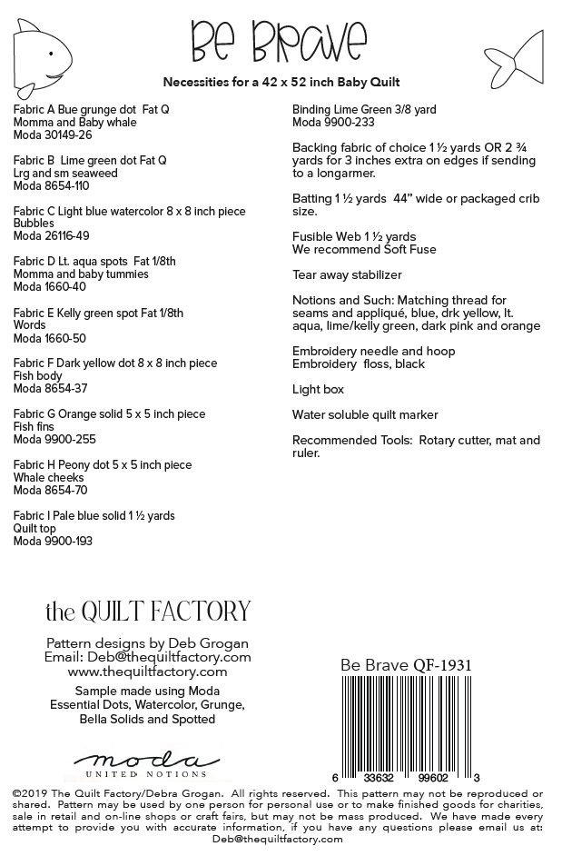 ©2019 The Quilt Factory/Debra Grogan. All rights reserved. This pattern may not be reproduced or shared. Pattern may be used by one person for personal use or to make finished goods for charities, sale in retail and on-line shops or craft fairs, but may not be mass produced. We have made every attempt to provide you with accurate information, if you have any questions please email us at: Deb@thequiltfactory.com