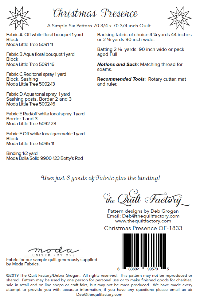 ©2019 The Quilt Factory/Debra Grogan. All rights reserved. This pattern may not be reproduced or shared. Pattern may be used by one person for personal use or to make finished goods for charities, sale in retail and on-line shops or craft fairs, but may not be mass produced. We have made every attempt to provide you with accurate information, if you have any questions please email us at: Deb@thequiltfactory.com