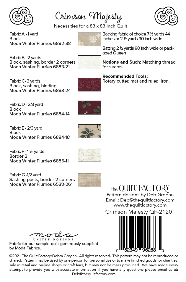 ©2022 The Quilt Factory/Debra Grogan. All rights reserved. The pattern may not be reproduced or shared. Pattern may be used by one person for personal use or to make finished goods for charities, sale in retail and on-line shops or craft fairs, but may not be mass produced. We have made every attempt to provide you with accurate information and fabric cuts, if you have any questions please email us at: Deb@thequiltfactory.com