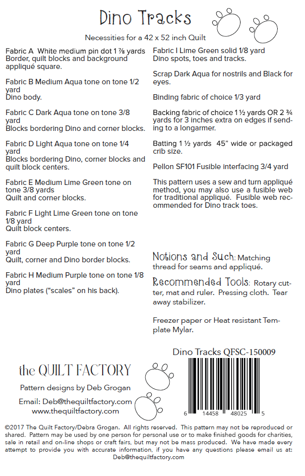 ©2016 The Quilt Factory/Debra Grogan. All rights reserved. This pattern may not be reproduced or shared. Pattern may be used by one person for personal use or to make finished goods for charities, sale in retail and on-line shops or craft fairs, but may not be mass produced. We have made every attempt to provide you with accurate information, if you have any questions please email us at: Deb@thequiltfactory.com