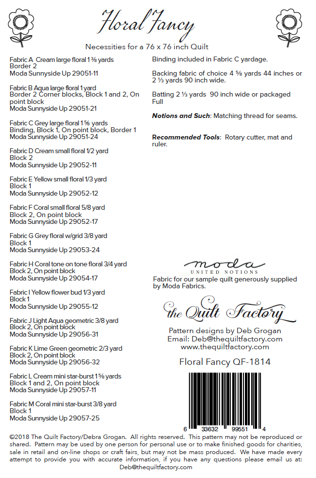 ©2018 The Quilt Factory/Debra Grogan.  All rights reserved.  This pattern may not be reproduced or shared.  Pattern may be used by one person for personal use or to make finished goods for charities, sale in retail and on-line shops or craft fairs, but may not be mass produced.  We have made every attempt to provide you with accurate information, if you have any questions please email us at: Deb@thequiltfactory.com