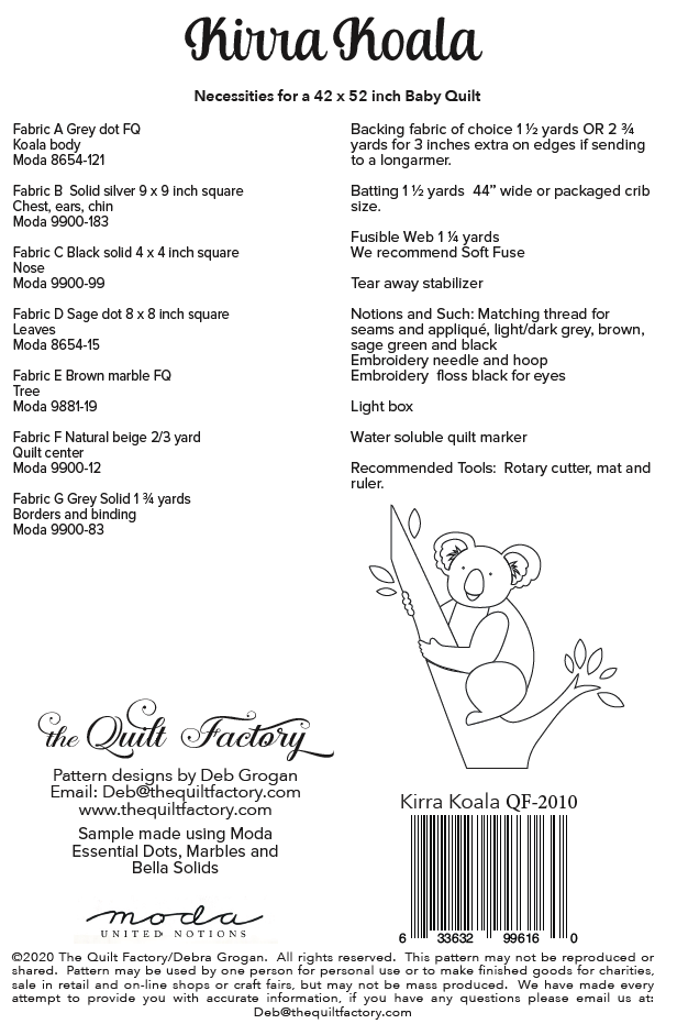 ©2020 The Quilt Factory/Debra Grogan. All rights reserved. This pattern may not be reproduced or shared. Pattern may be used by one person for personal use or to make finished goods for charities, sale in retail and on-line shops or craft fairs, but may not be mass produced. We have made every attempt to provide you with accurate information, if you have any questions please email us at: Deb@thequiltfactory.com