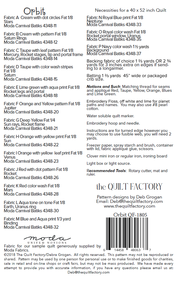 ©2018 The Quilt Factory/Debra Grogan. All rights reserved. This pattern may not be reproduced or shared. Pattern may be used by one person for personal use or to make finished goods for charities, sale in retail and on-line shops or craft fairs, but may not be mass produced. We have made every attempt to provide you with accurate information and fabric cuts, if you have any questions please email us at: Deb@thequiltfactory.com
