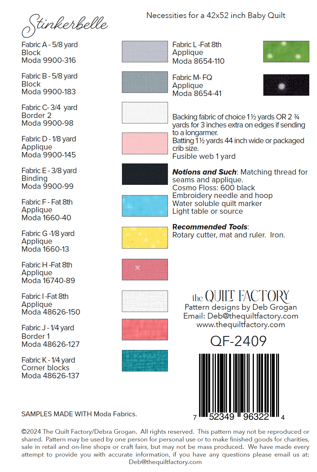 ©2024 The Quilt Factory/Debra Grogan. All rights reserved. The pattern may not be reproduced or shared. Pattern may be used by one person for personal use or to make finished goods for charities, sale in retail and on-line shops or craft fairs, but may not be mass produced. We have made every attempt to provide you with accurate information, if you have any questions please email us at: Deb@thequiltfactory.com