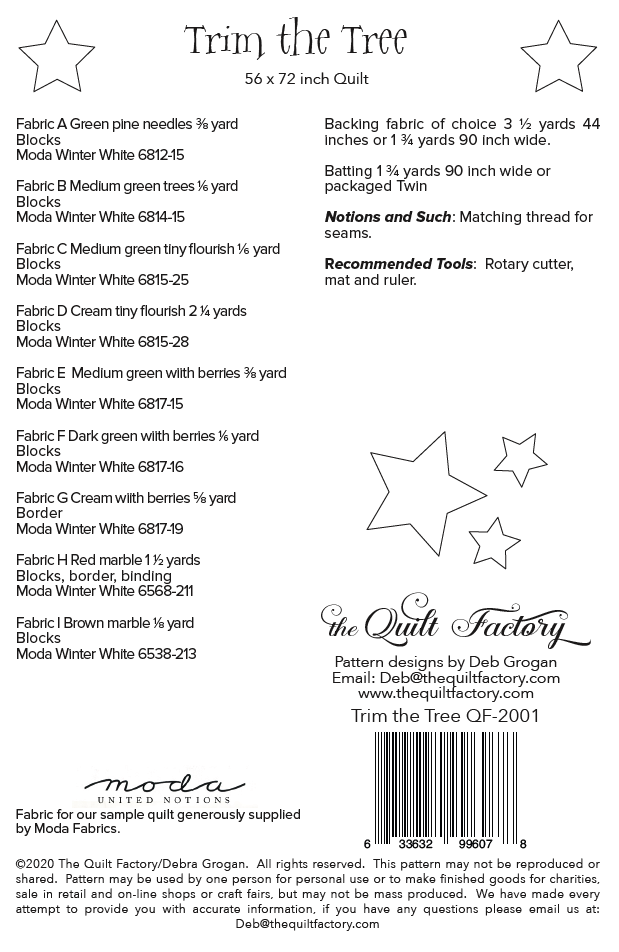 ©2021 The Quilt Factory/Debra Grogan. All rights reserved. This pattern may not be reproduced or shared. Pattern may be used by one person for personal use or to make finished goods for charities, sale in retail and on-line shops or craft fairs, but may not be mass produced. We have made every attempt to provide you with accurate information, if you have any questions please email us at: Deb@thequiltfactory.com