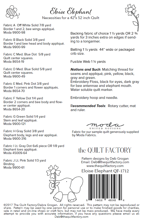 ©2017 The Quilt Factory/Debra Grogan. All rights reserved. This pattern may not be reproduced or shared. Pattern may be used by one person for personal use or to make finished goods for charities, sale in retail and on-line shops or craft fairs, but may not be mass produced. We have made every attempt to provide you with accurate information, if you have any questions please email us at: Deb@thequiltfactory.com