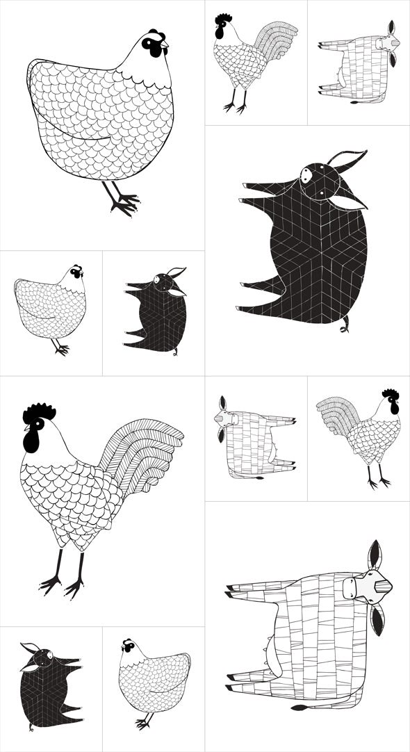 Farm Fresh - Farm Animals Black and White Panel by Gingiber for Moda Fabrics.