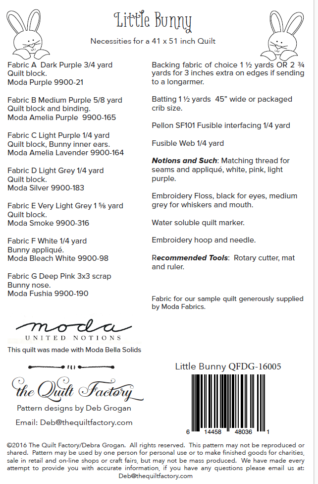 ©2016 The Quilt Factory/Debra Grogan. All rights reserved. This pattern may not be reproduced or shared. Pattern may be used by one person for personal use or to make finished goods for charities, sale in retail and on-line shops or craft fairs, but may not be mass produced. We have made every attempt to provide you with accurate information, if you have any questions please email us at: Deb@thequiltfactory.com