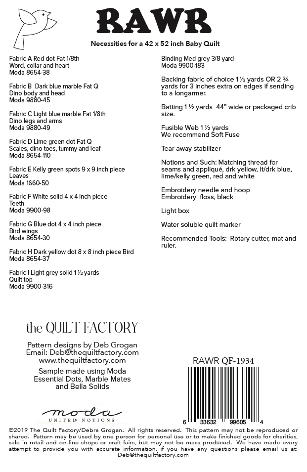 ©2019 The Quilt Factory/Debra Grogan. All rights reserved. This pattern may not be reproduced or shared. Pattern may be used by one person for personal use or to make finished goods for charities, sale in retail and on-line shops or craft fairs, but may not be mass produced. We have made every attempt to provide you with accurate information, if you have any questions please email us at: Deb@thequiltfactory.com