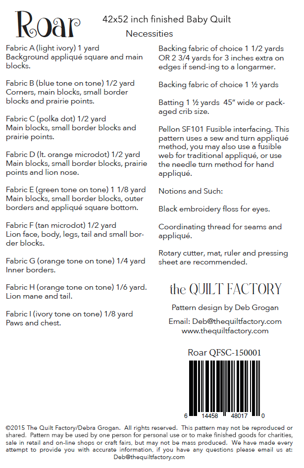 ©2016 The Quilt Factory/Debra Grogan. All rights reserved. This pattern may not be reproduced or shared. Pattern may be used by one person for personal use or to make finished goods for charities, sale in retail and on-line shops or craft fairs, but may not be mass produced. We have made every attempt to provide you with accurate information, if you have any questions please email us at: Deb@thequiltfactory.com