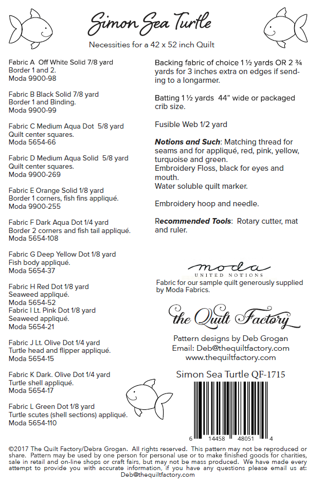 Simon Sea Turtle is an adorable quilt perfect for baby. Dimensional elements add fun to this quilt, a must have for any baby. Our easy to piece and appliqué quilt pattern includes instructions and templates.