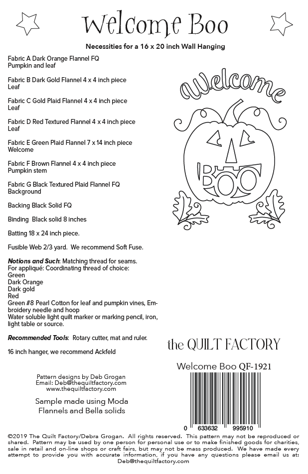Welcome Boo is a cute wallhanging and will make a cute addition to your Halloween decor! The quilt pattern includes instructions and templates.