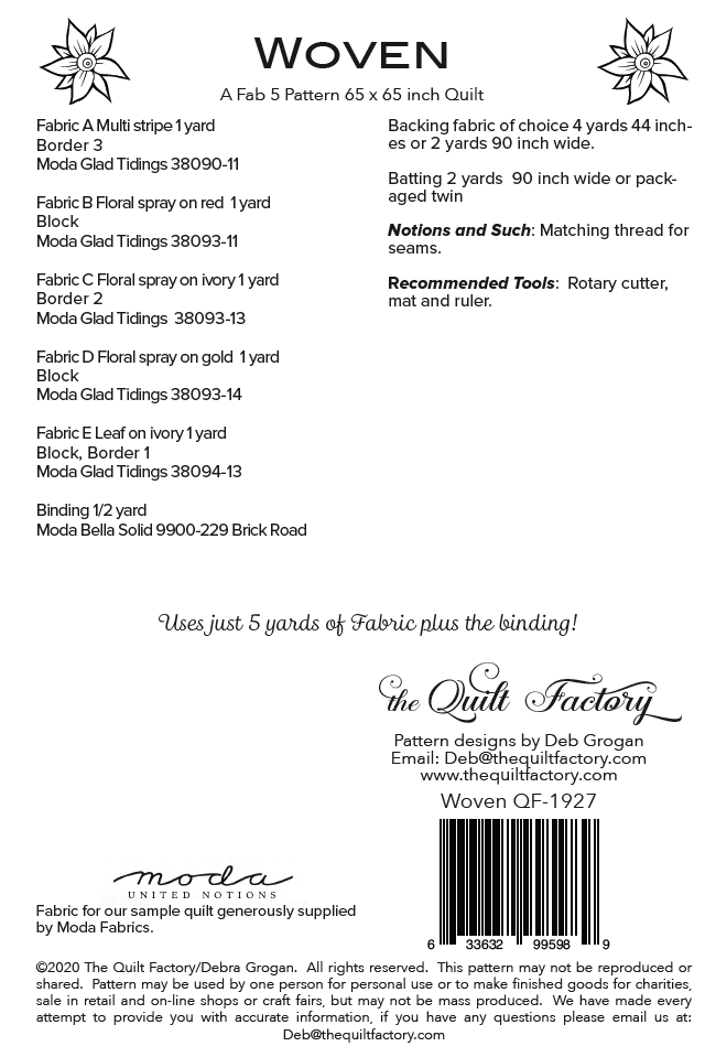 ©2020 The Quilt Factory/Debra Grogan. All rights reserved. This pattern may not be reproduced or shared. Pattern may be used by one person for personal use or to make finished goods for charities, sale in retail and on-line shops or craft fairs, but may not be mass produced. We have made every attempt to provide you with accurate information, if you have any questions please email us at: Deb@thequiltfactory.com